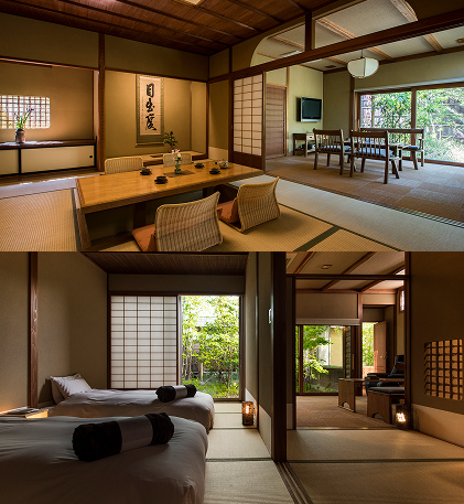 The spacious suites, comprising a main room, bedroom, and living area, create a soothing atmosphere with a touch of nostalgia. Each suite features its own uniquely designed open-air bath, where you can enjoy 100% natural hot spring water flowing directly from the source while gazing out at the garden—a moment of pure bliss.