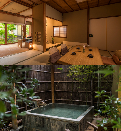The spacious suites, comprising a main room, bedroom, and living area, create a soothing atmosphere with a touch of nostalgia. Each suite features its own uniquely designed open-air bath, where you can enjoy 100% natural hot spring water flowing directly from the source while gazing out at the garden—a moment of pure bliss.