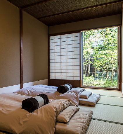 寬敞的套房包含主臥室、臥室與起居區,營造出一種帶有懷舊氣息的舒緩氛圍。每間客房均設有獨特設計的露天風呂,您可以一邊眺望庭園,一邊享受源泉掛流的 100% 天然溫泉——這是一段純粹幸福的時光。